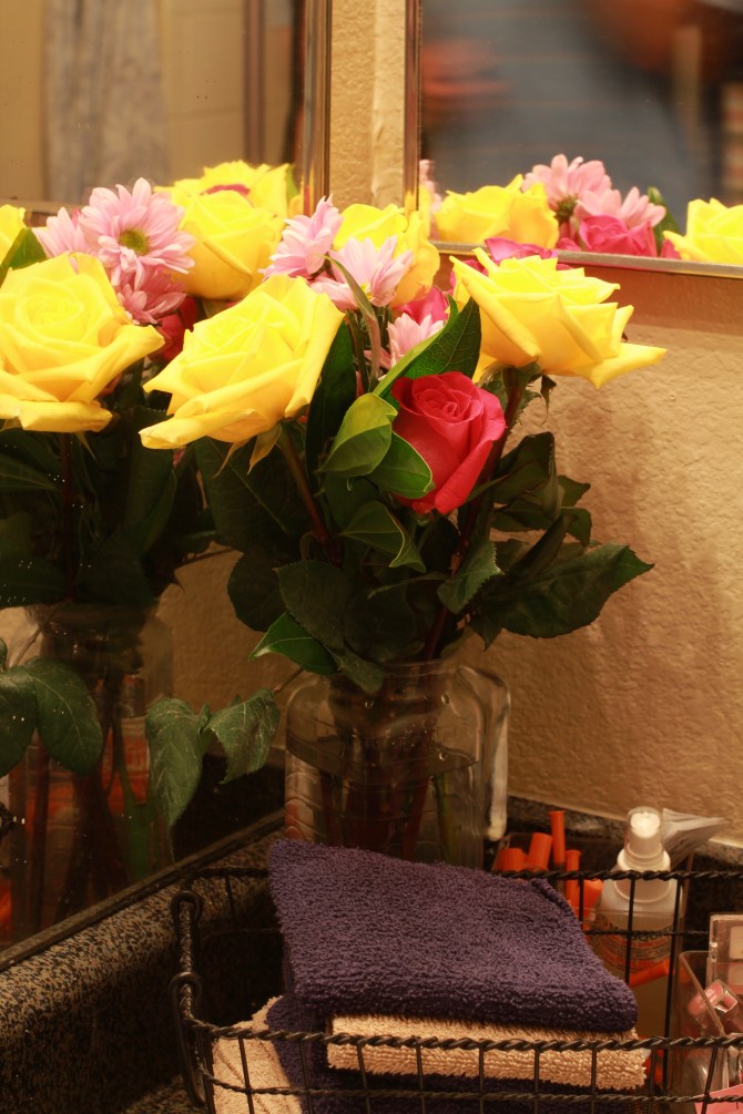 We recently celebrated Heidi’s birthday, and in lieu of going out to dinner, since she is on a restricted diet, I bought her flowers. It was quite the surprise for her, because I brought the red roses to her while she was as work at Starbuck’s. She didn’t know that I loaded up on dozens of flowers until she came home and found all these arrangements around the apartment. It was a great joy to surprise her with flowers in every room of the house, except the laundry room (we really only have a laundry hall, and it’s not a house, but a one bedroom apartment).
