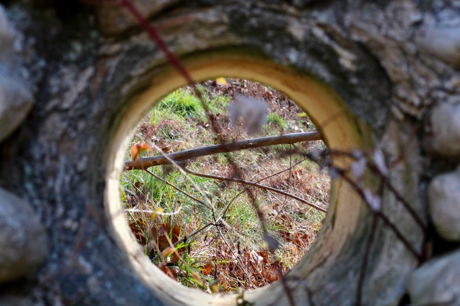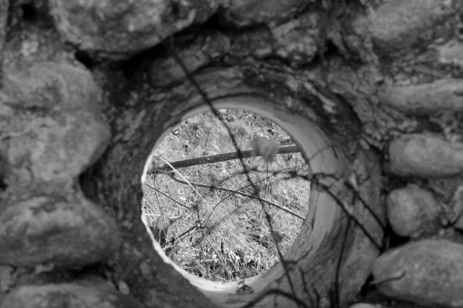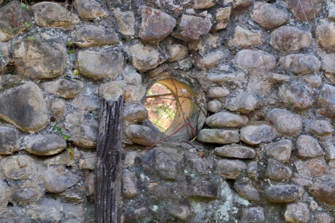 Next to the cabins where we stayed in November, there is a small dam which has fallen into disrepair. The dam is now just a wall, with a hole in it.