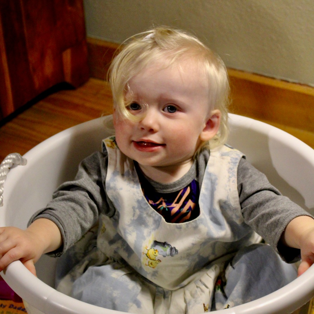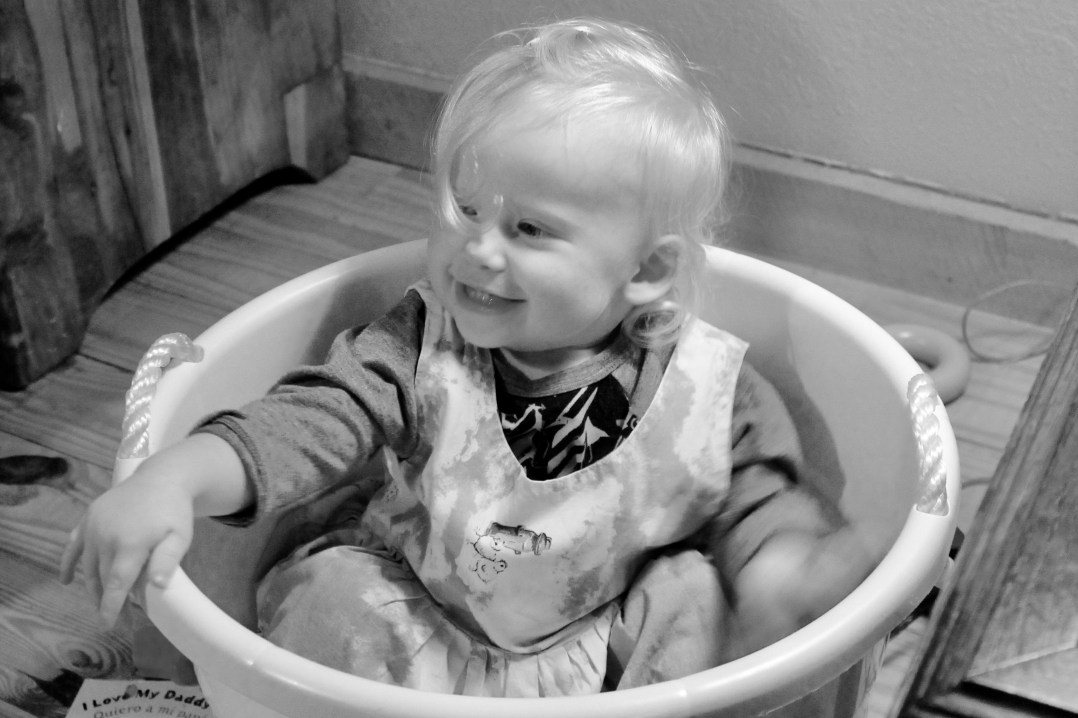 We all know how it goes: buy a child a present and they end up playing with the box. In this case, Annaleise was playing with the bucket used to bring her toys out to the cabin. It is cute enough just with that. But then, Annaleise adds the icing-on-the-cake cute.