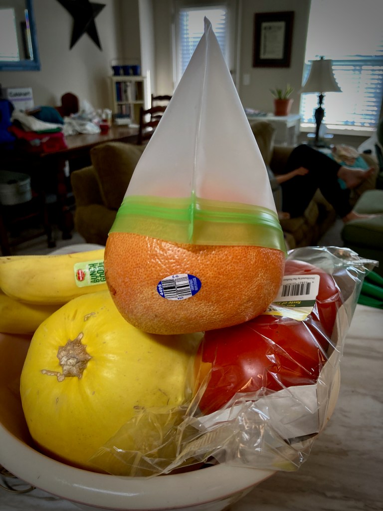 I put the reusable bag on the grapefruit to dry, and immediately thought of VeggieTales. For those of you who know that show, can you leave this post without the theme song getting stuck in your head?