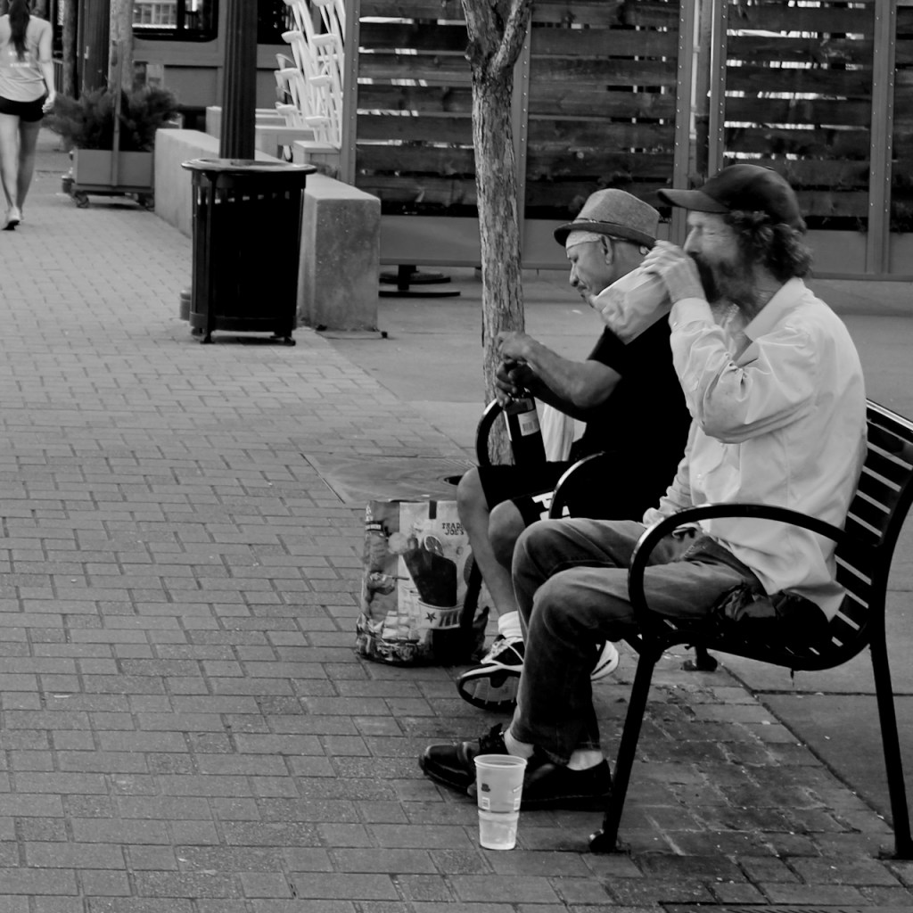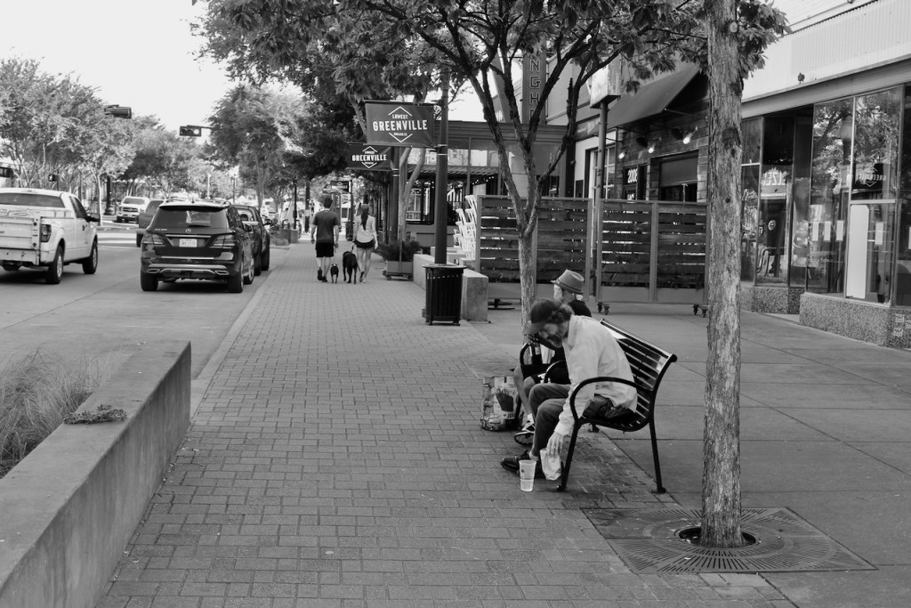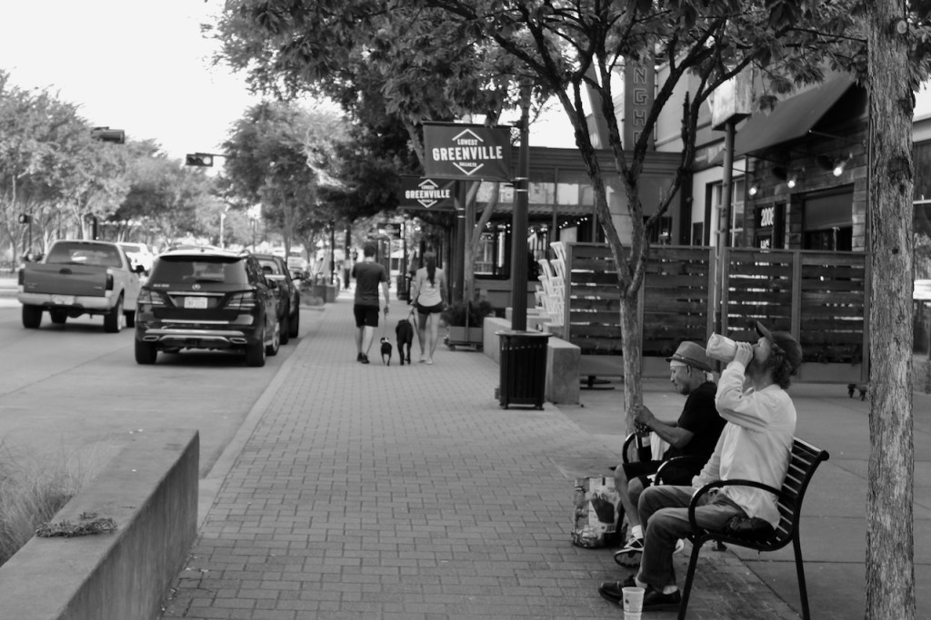 Heidi and I drove down to the Lowest Greenville area of Dallas a few weeks ago to go to Trader Joe’s. While she was shopping, I stepped outside with my camera to take a few pictures. It was about 9 a.m., and yet, these two gentlemen (used loosely) were already tilting back the bottle. As the saying goes, “it’s five o’clock somewhere.”