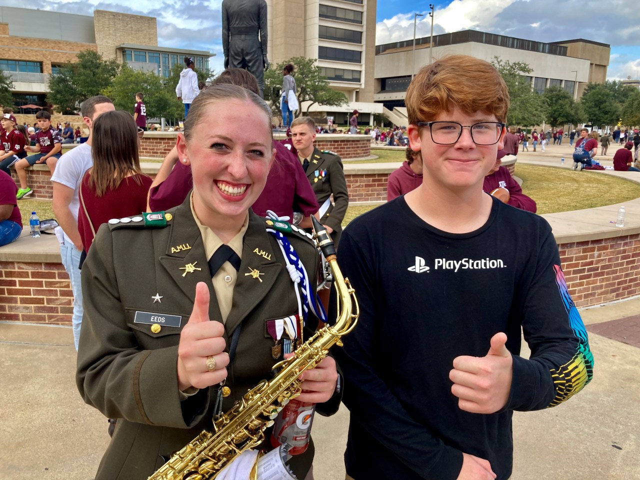 That is one of the reasons I made sure and took him to the Texas A&M football game two Saturday’s ago. I wanted him to see the Fightin’ Texas Aggie Band. He also got to meet one of the members of the band, Courtney Eeds. Turns out that Courtney knew Joey and Andy’s cousin, Tanner C., who graduated last year from the Corps of Cadets and was ranked really high up in the organization.