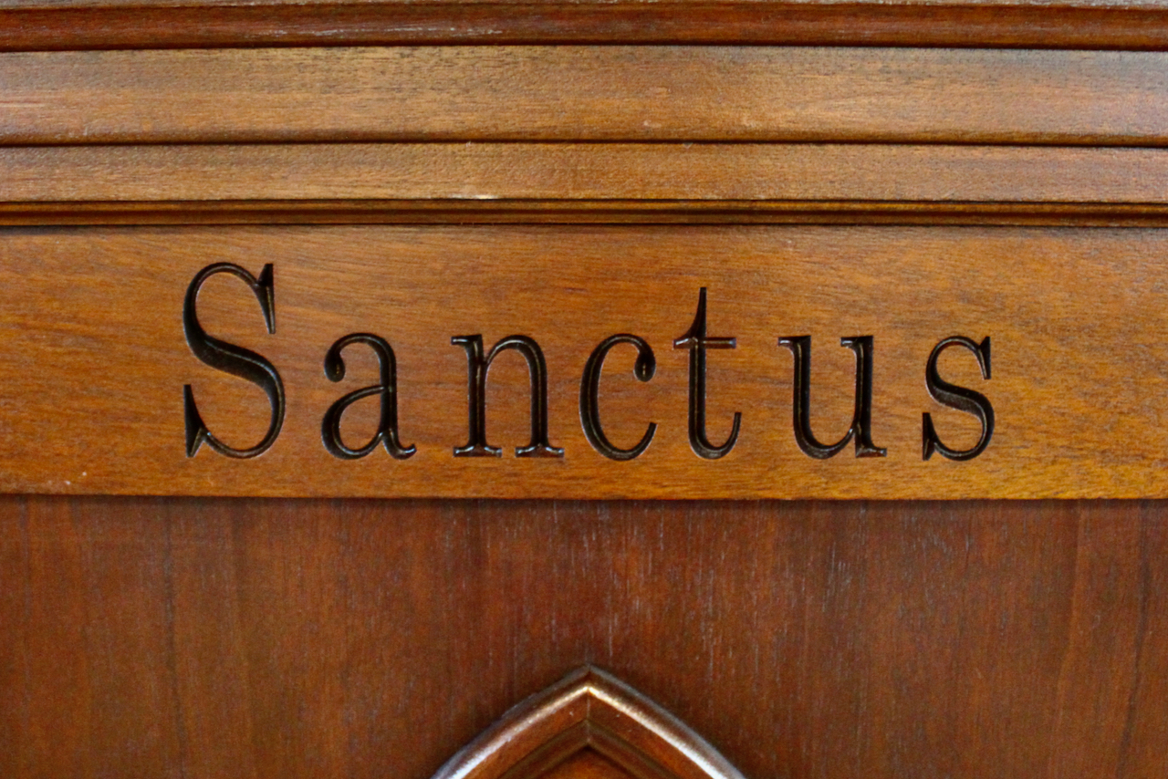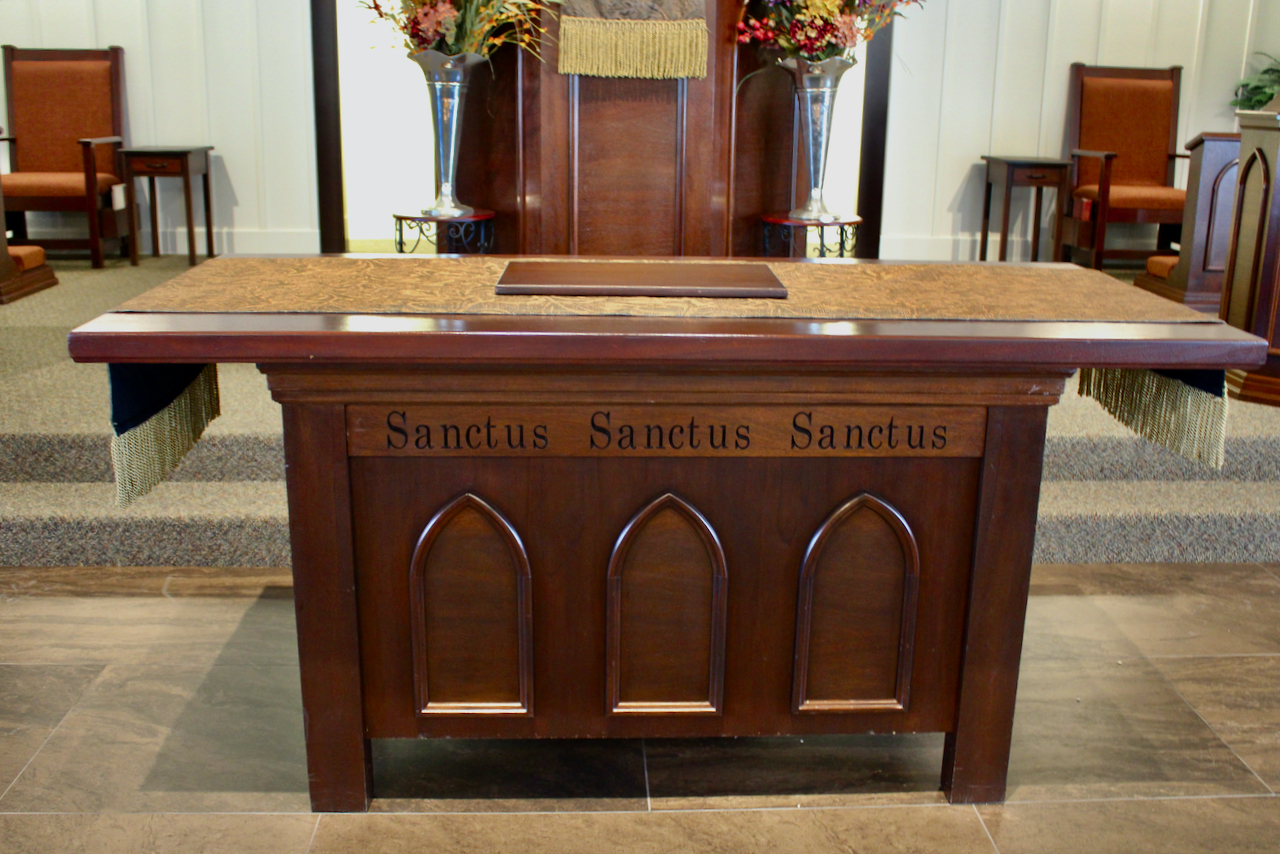 The communion table with the Latin for “holy, holy, holy.” Both in Isaiah 6 and Revelation 5, we see the angels before the LORD saying “holy, holy, holy,” about the LORD almighty. When we say as much in worship, we are joining the worship that is already taking place before the throne of God.