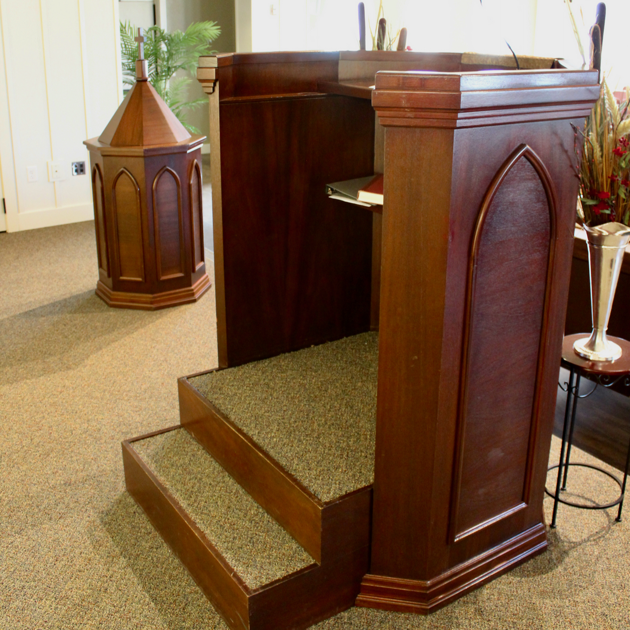 It is proper, because the pastor has to step up into the pulpit to preach. Many wrongly assume that such pulpits exalt the man above the people. This is not the purpose of a raised pulpit. The raised pulpit exalts the word of God over all, including the pastor. Even he has to step up to the word in order to preach it, reminding him that he is in that pulpit by God’s grace alone.