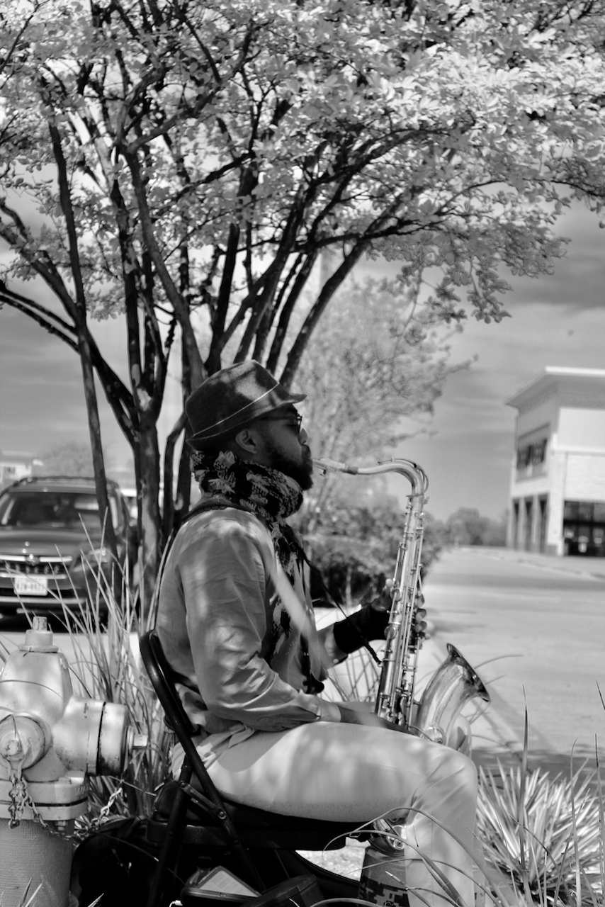 Heidi and I took advantage of the sunny weather and walked over to an area super market to get some yellow onions. I know, probably too much information. But that was what we were doing when we rounded the corner of the Hobby Lobby and heard someone playing a saxophone, and playing it well.